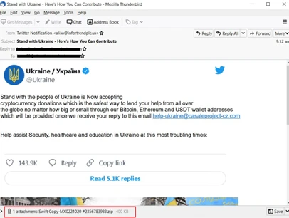 Figura 1. Un ejemplo de correo electrónico de phishing que aprovecha el conflicto en Ucrania para enganchar a los usuarios para que realicen donaciones en moneda virtual